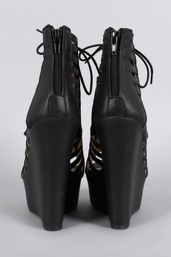 This stylish wedge features an open toe design, strappy caged construction with lace up detail, and wrapped platform wedge heel. Finished with lightly padded insole and rear zipper closure for easy on/off.